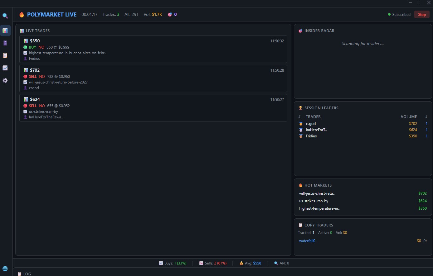 A powerful desktop application that monitors every Polymarket trade in real-time, detects insider activity, and lets you copy-trade the best performers β all from one elegant interface.